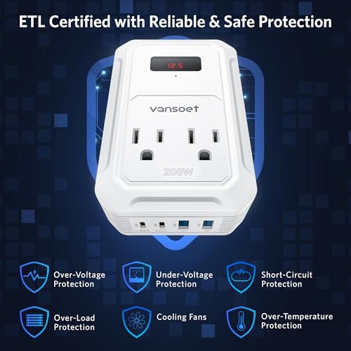 Vansoet Advantage: America’s leading power inverter brand. Provides 200 Watts continuous DC 12v to AC 110v power inverter featuring 2xPD (65W/30W)&2xQC 18W USB ports, 2 AC outlets, and a 23.8-inch cable with cigarette lighter plug and LCD Display for you, more convenient.