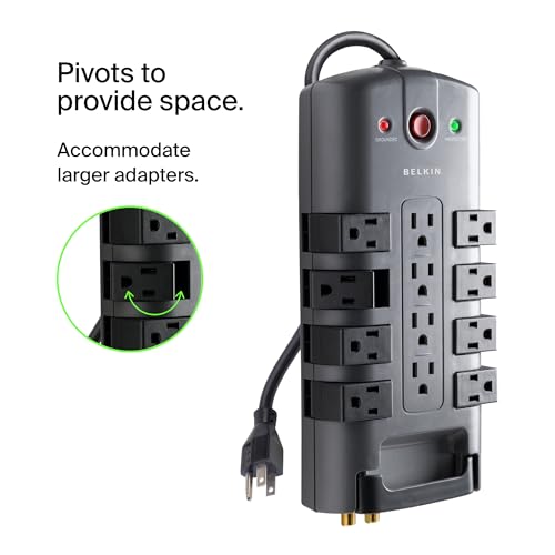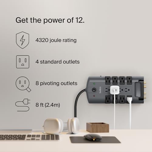 Specification: Belkin Surge Protector Power Strip w/ 8 Rotating & 4 Standard Outlets – 8ft Sturdy Extension Cord w/ Flat Pivot Plug for Home, Office, Travel, Desktop & Charging Brick – 4320 Joules of Protection