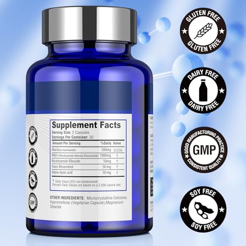 Specification: NAD Supplement 1000mg Pure Organic & Niacin(Vitamin B3) 500mg, NAD Supplement for Woman and Man, Nicotinamide Riboside (NR) Supports Anti-Aging, Energy, Brain, Non-GMO, Gluten-Free